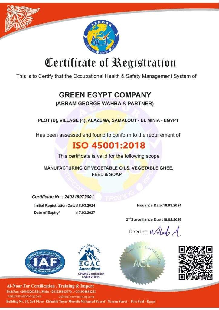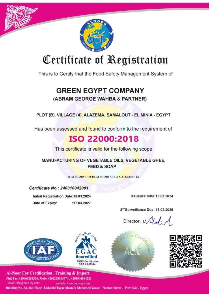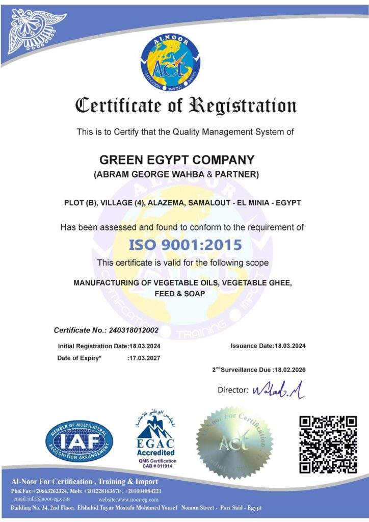 كما تلقت شركة جرين ايجيبت نظام إدارة الجودة